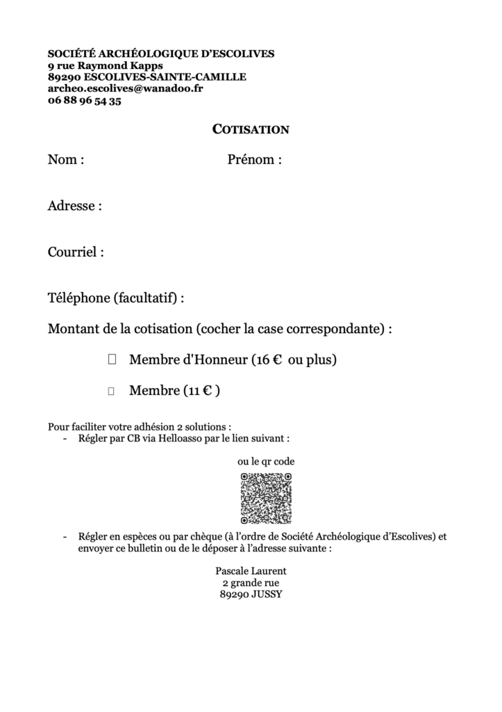 Vous pouvez soit régler en espèces ou par chèque (à l’ordre de Société Archéologique d’Escolives) et envoyer votre bulletin d’adhésion à la Présidente