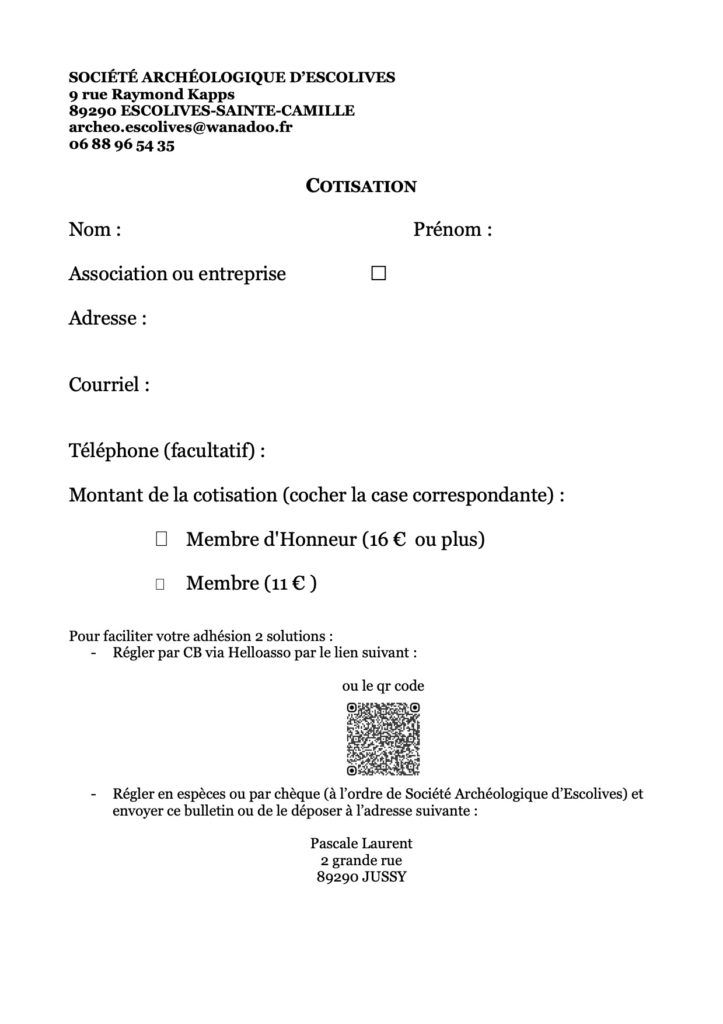 Vous pouvez soit régler en espèces ou par chèque (à l’ordre de Société Archéologique d’Escolives) et envoyer votre bulletin d’adhésion au siège sociale ou à la Présidente